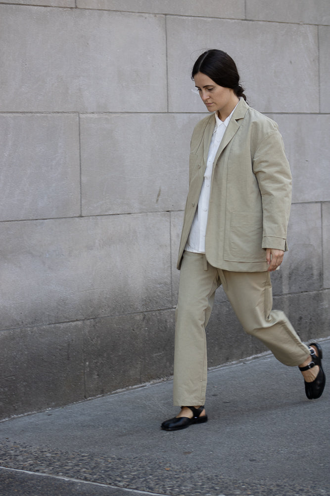 43% cotton / 39% nylon / 9% linen / 9% ramie, this fabric has a smooth hand for a polished look
