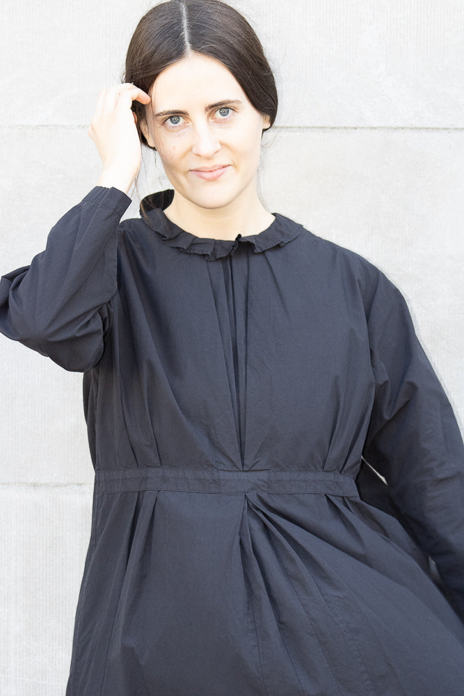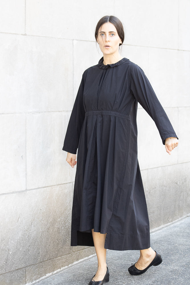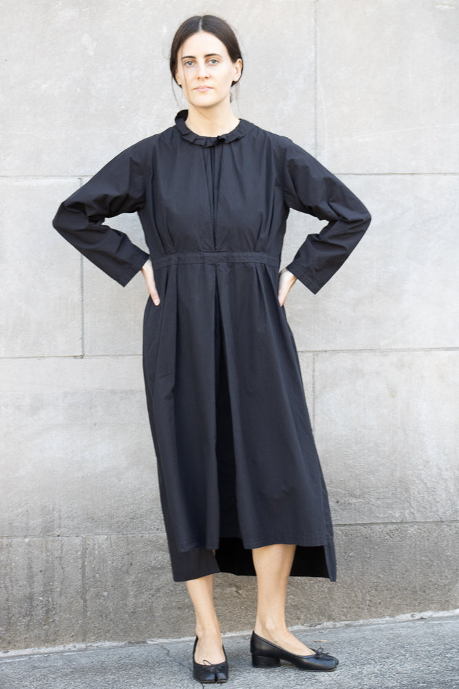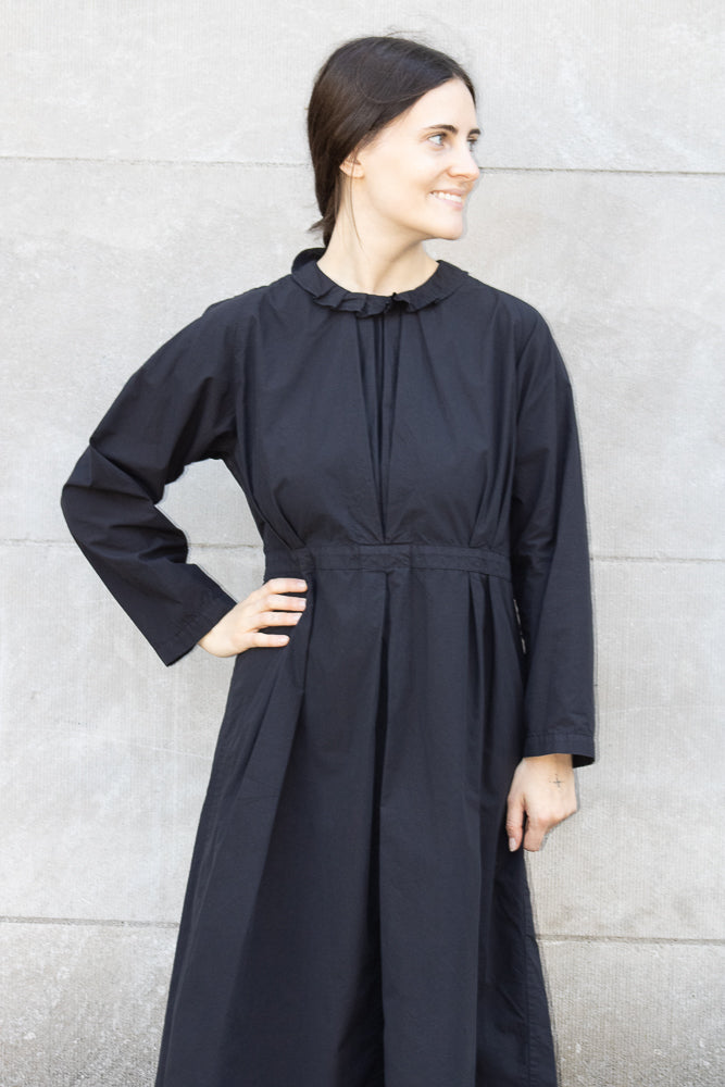 Dress with classic frilled collar and pleats in the front, slips on overhead with four covered buttons at the back neck