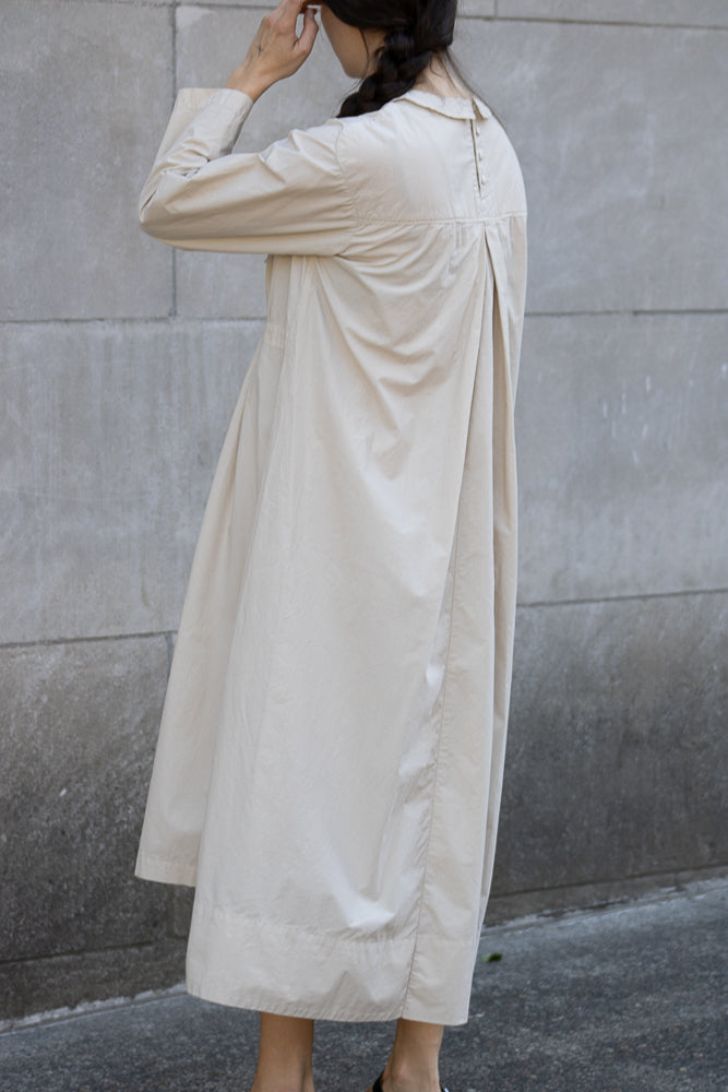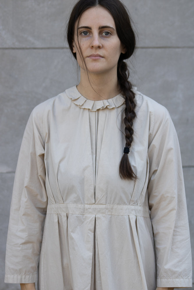 Dress with classic frilled collar and pleats in the front, slips on overhead with four covered buttons down the back neck. Made of silk-cotton broadcloth.